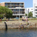 Ici, on s’éloigne un peu du bruit urbain des voitures, et on se rapproche des bruits portuaires, les machines, les bateaux, les machineries, et on a la chance d’avoir tous les gamins qui se baignent. C'est bien d’investir l’espace public. La taille des espaces fait qu’on n’est pas du tout confinés. C’est aussi l’esprit de la ville reconstruite, les grandes avenues... Il y a le bruit du vent. C’est notable pour quelqu’un qui ne connaît pas cette ambiance portuaire, c’est le bruit du port, et encore on est entre la ville et le port ici. C’est un peu frontalier, le bassin c’est la frontière. Il y a une séparation, nette, mais ça communique.